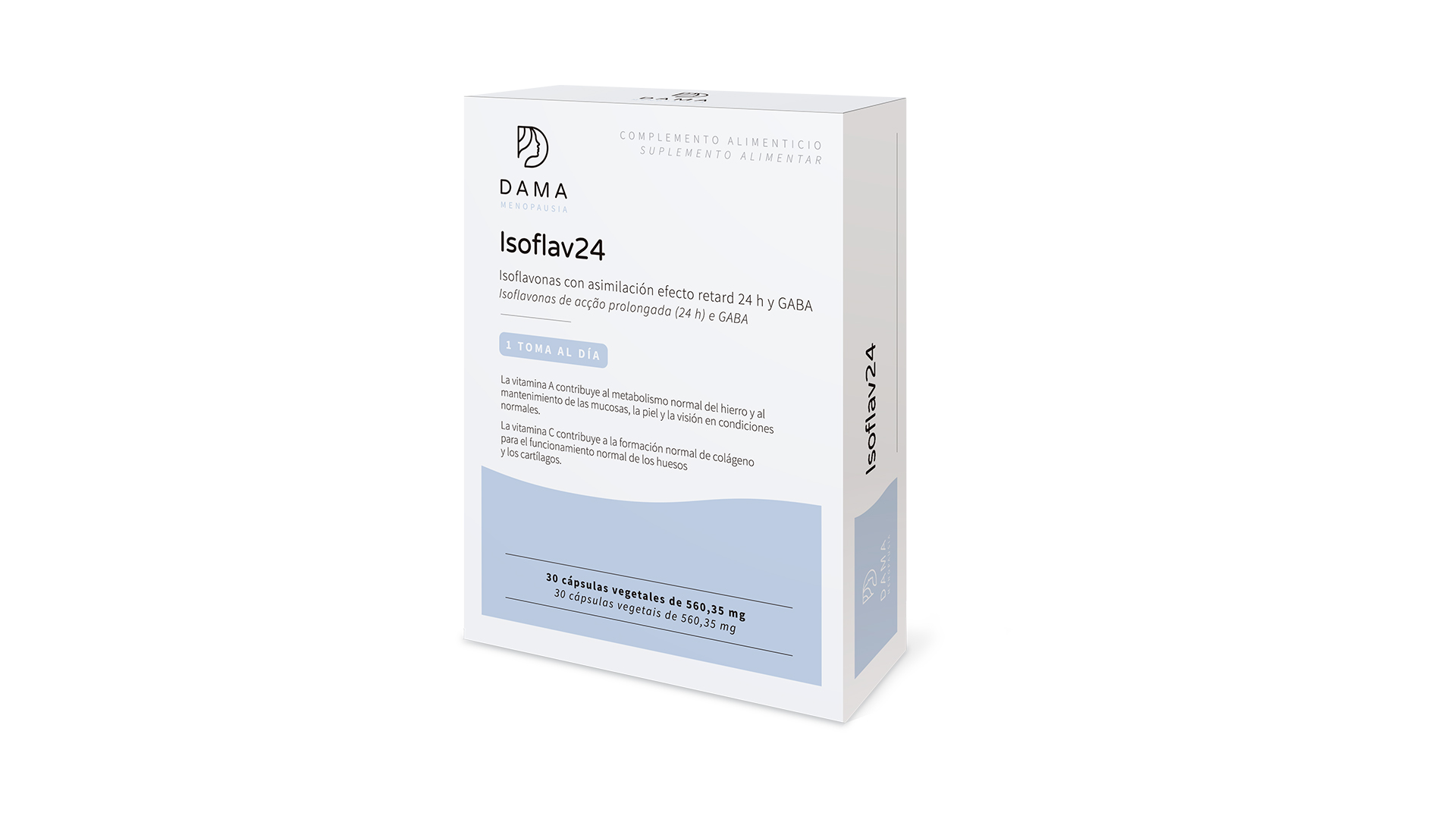 Complemento alimenticio formulado a base de soja rica en isoflavonas, GABA (ácido gamma aminobutírico), extracto de ñame y vitaminas (A, C, B1, B2, B12 y E al 100% de los Valores de Referencia de Nutrientes-VRN a la dosis recomendada de una cápsula). Efecto 24 horas por la asimilación retard, por lo que solo es necesario una toma al día.