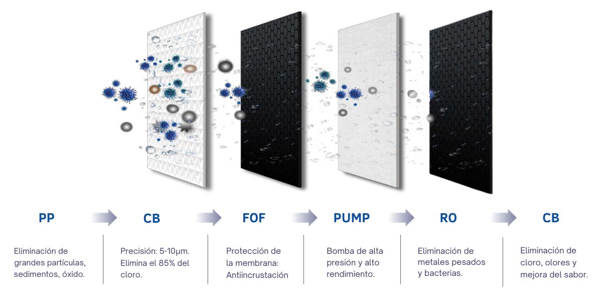 Este equipo incorpora un sistema de 5 etapas Long Life compuesto por: